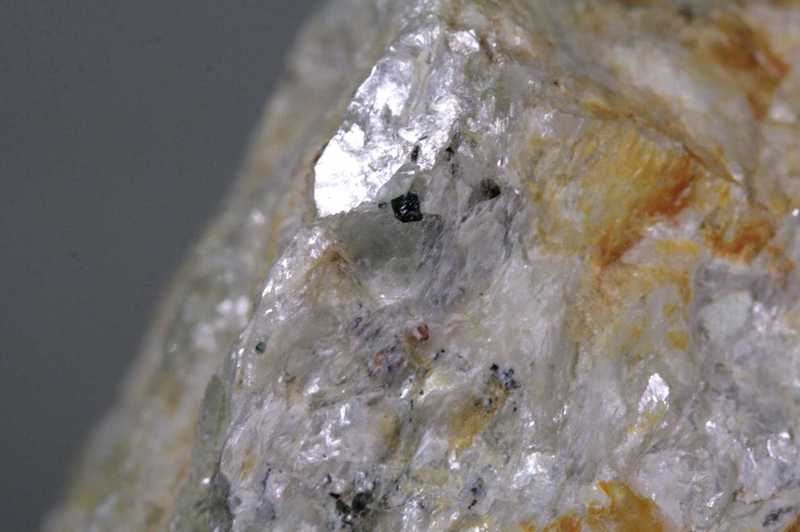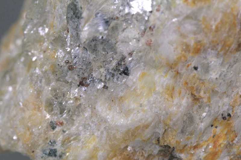 Zinkreicher Spinell Gahnit aus der Pegmatitfundstelle in den Jeseníky. Kleine grüne bis schwarze Gahnit-Körner eingewachsen in Sillimanit-Pegmatit.