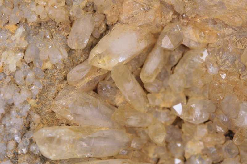 Ästhetisches Beispiel für Bergkristall-Kristalle vom Standort Banská Belá. Eine reiche, unbeschädigte Druse von säulenförmigen Kristallen des Bergkristalls, die eine Größe von bis zu 25 mm erreichen .