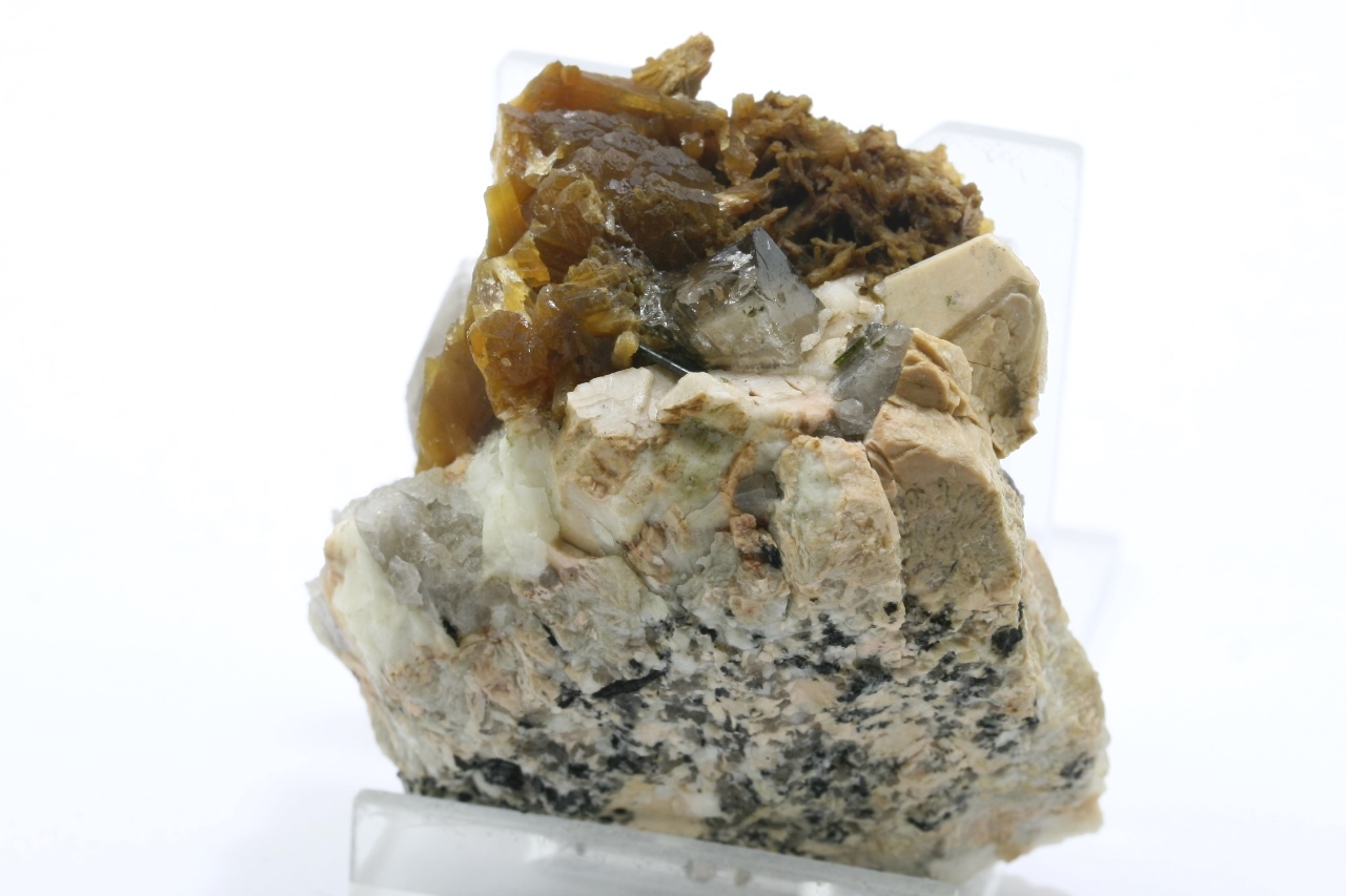 Krystalle von braunem Stilbit bis zu 2,5 cm Größe mit Záhněda, beigefarbenem Orthoklas und schwarzem, feinkristallinem Strigovit (eine Varietät von Chamosit).