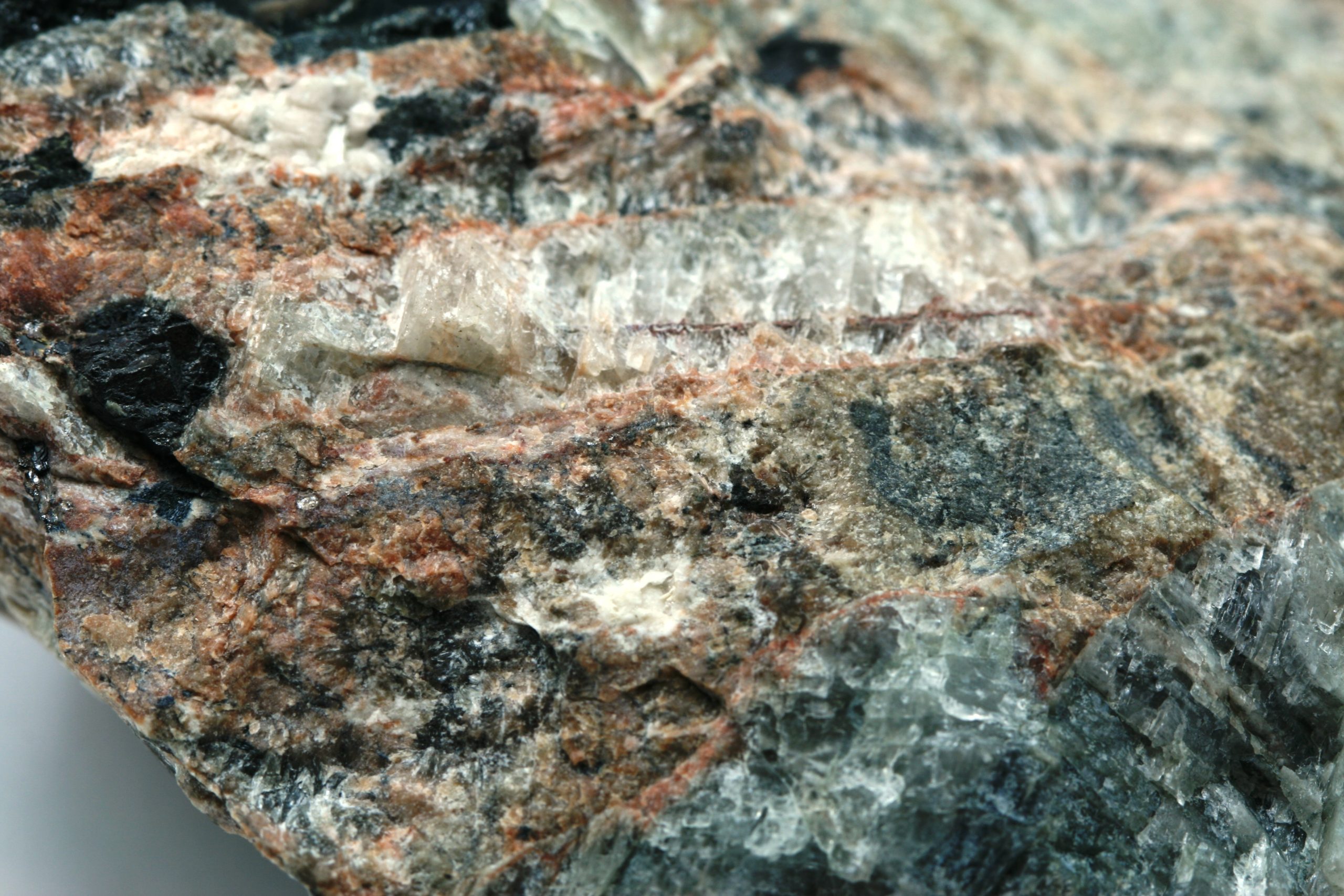 Zirconolit bildet auf dem Exemplar einen großen schwarzen Zwilling.