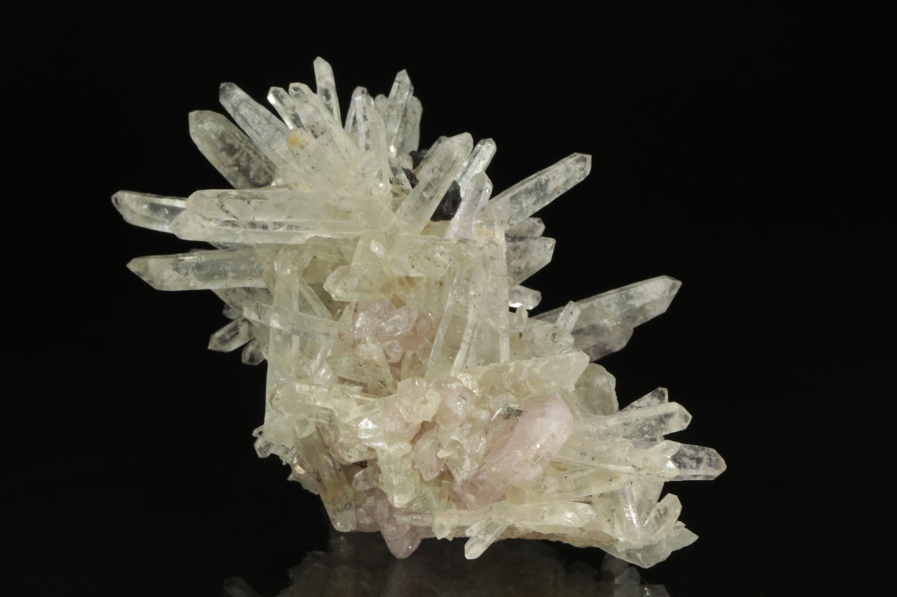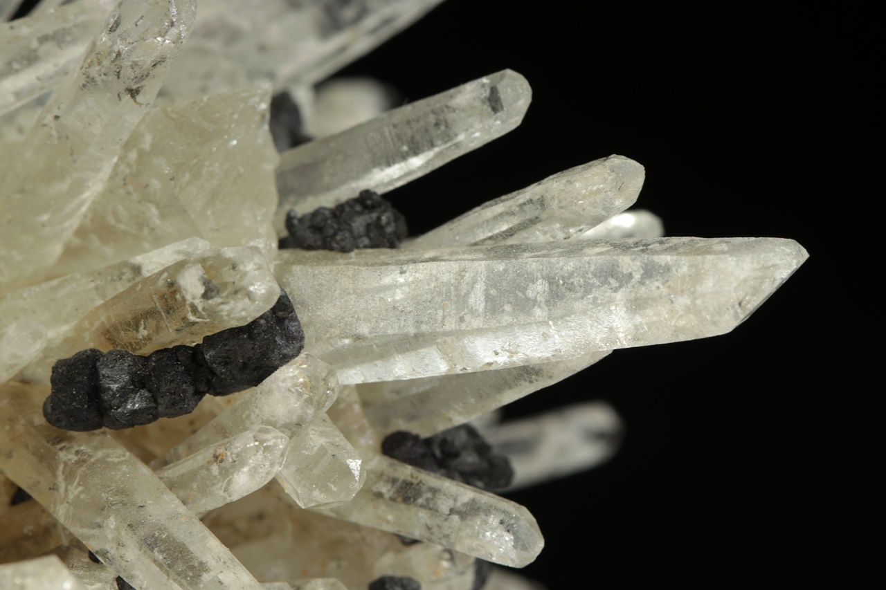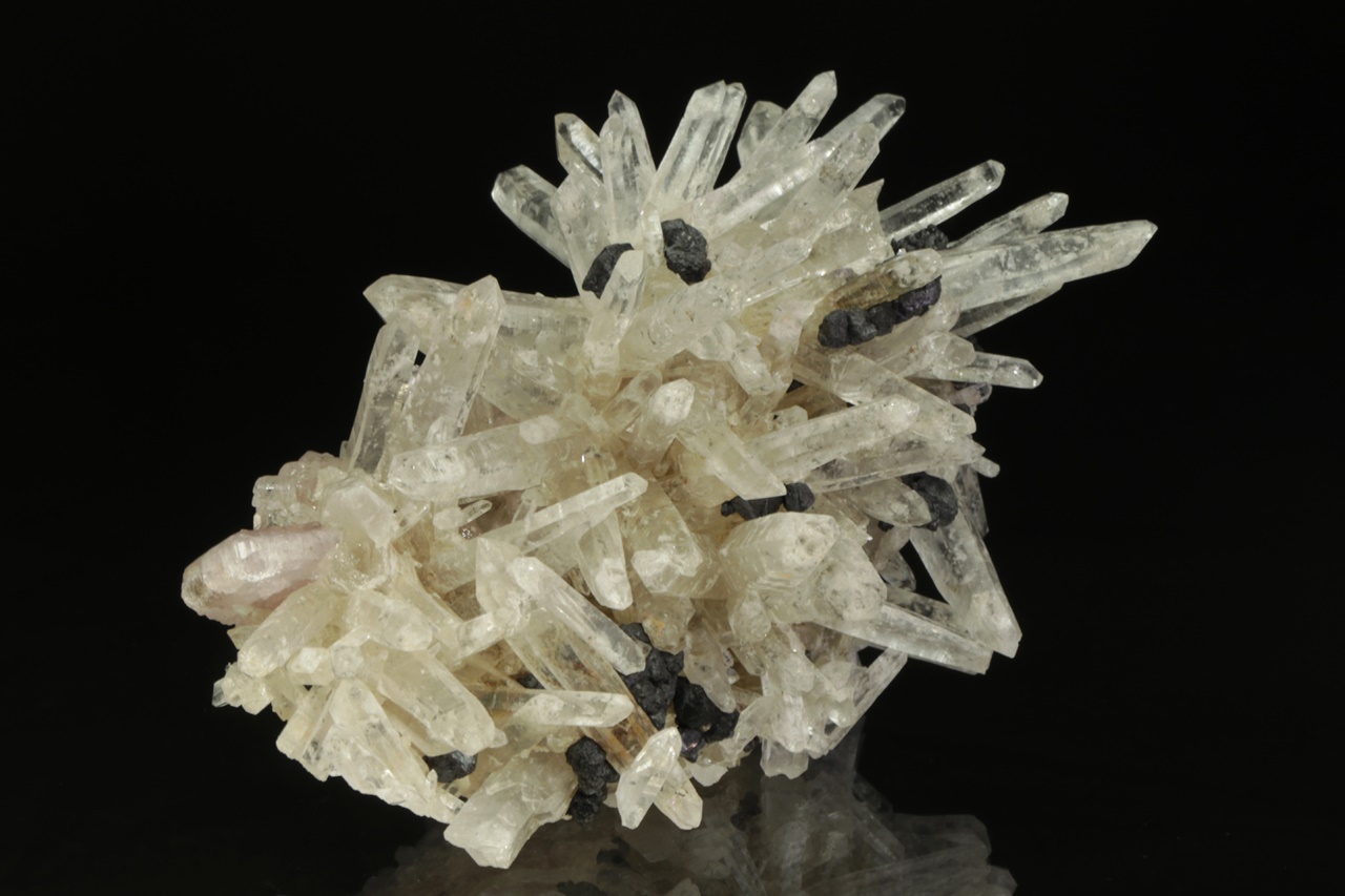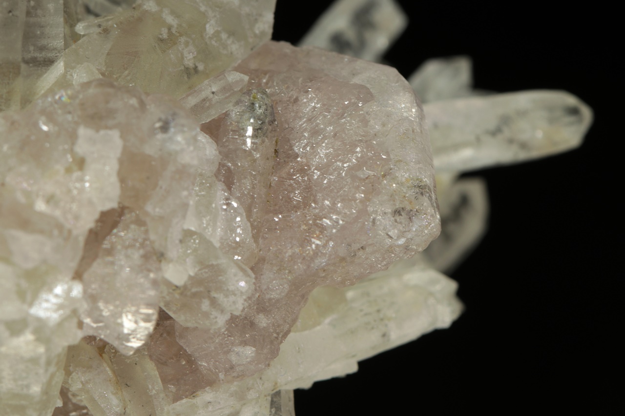 Křišťálová drúza s krystaly dlouhými až 4 cm velkými, porostlá černými krystaly sfaleritu. Zvláštností jsou pak tabulární krystaly světle růžového apatitu. Jedná se o nové nálezy z této lokality. Největší krystal apatitu je 1,5 cm velký.