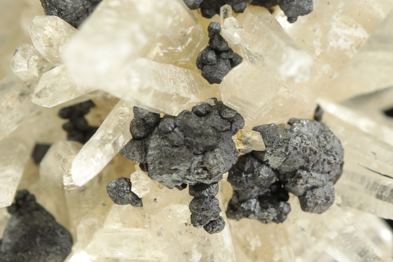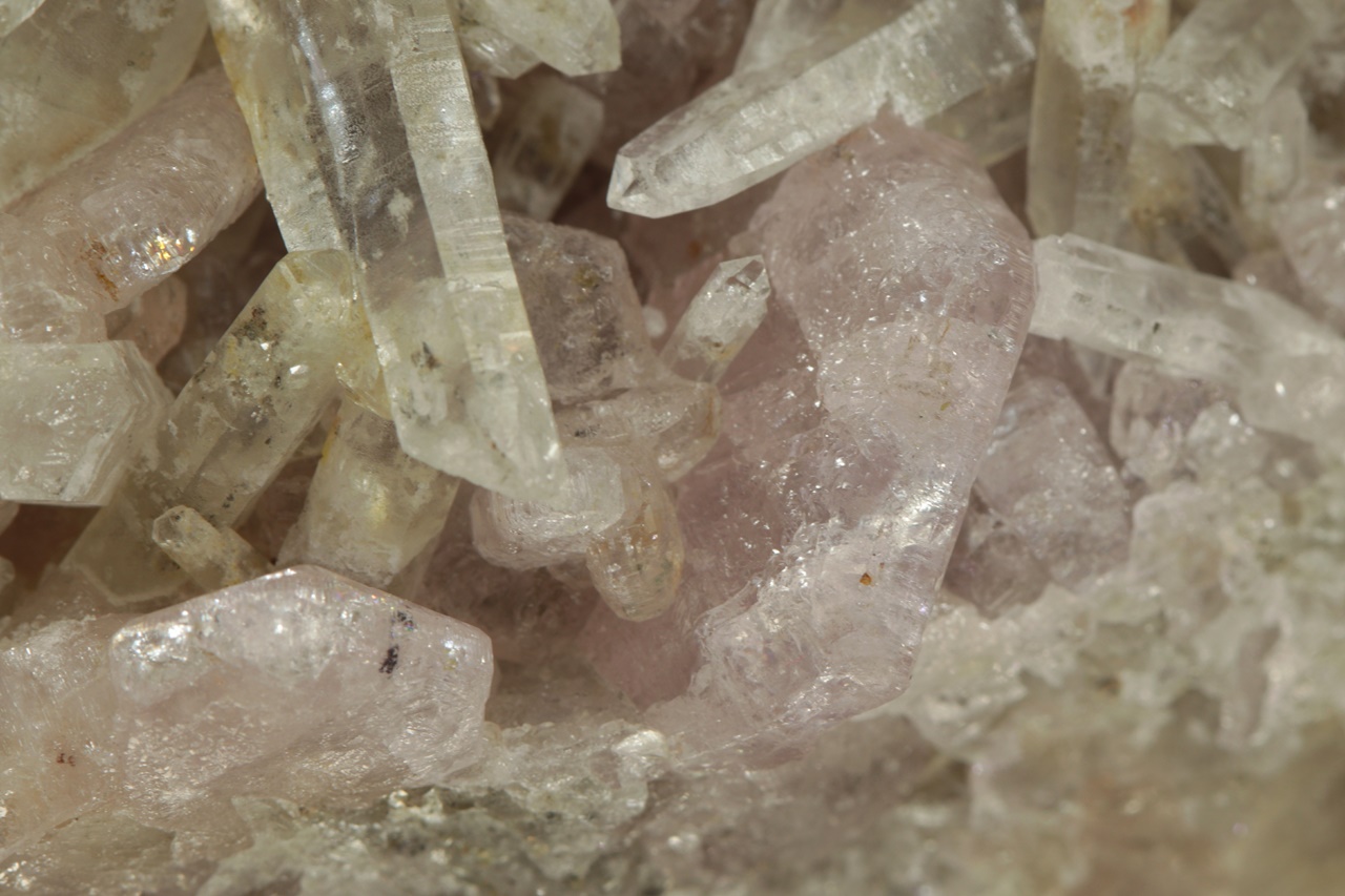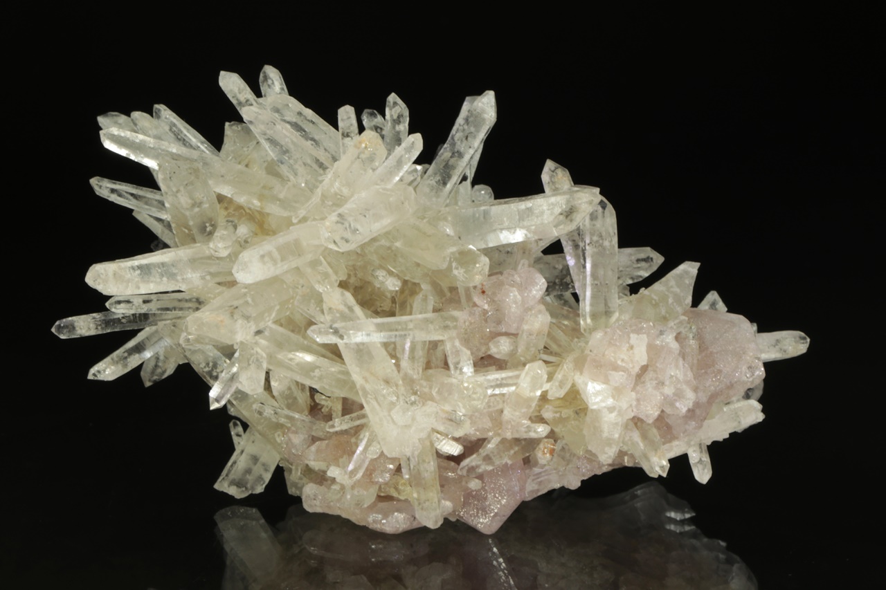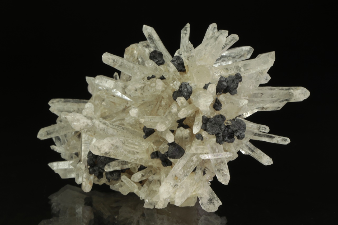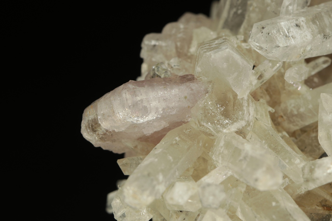 Křišťálová drúza s krystaly dlouhými až 4 cm velkými, porostlá černými krystaly sfaleritu. Zvláštností jsou pak tabulární krystaly světle růžového apatitu. Jedná se o nové nálezy z této lokality. Největší krystal apatitu je 1,5 cm velký.