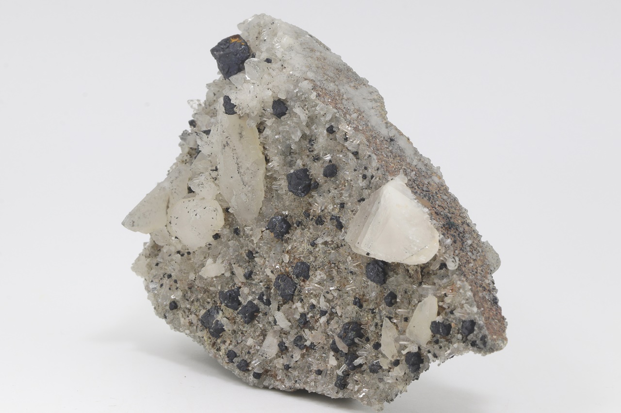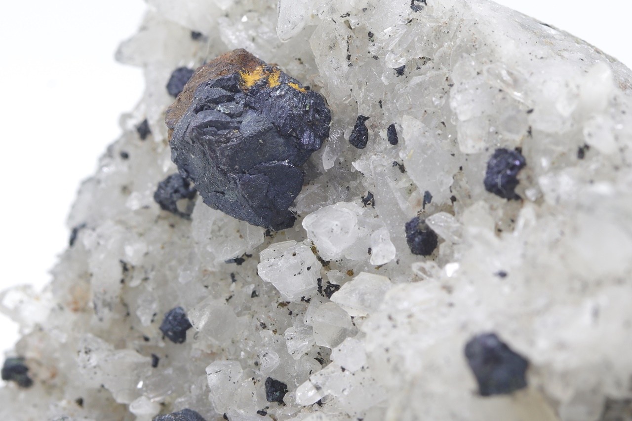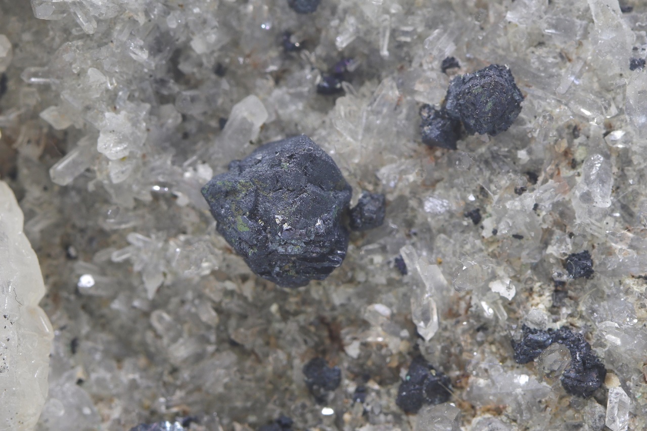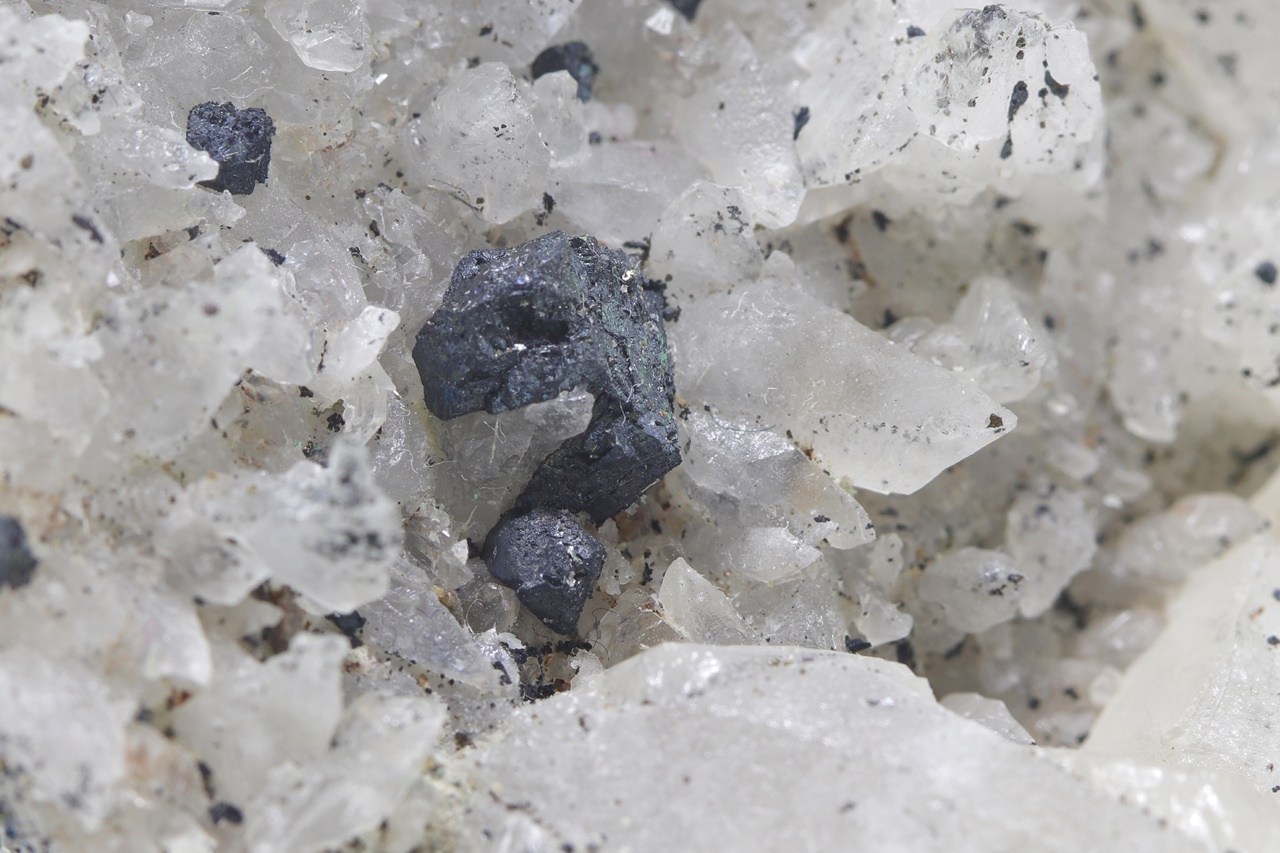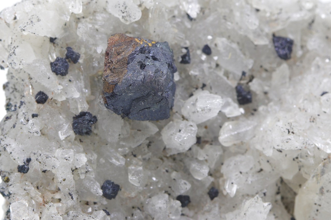 Reicher Stufe oktaedrischer Bornitkristalle gewachsen auf Kristallen von klarem Quarz mit weißen Skalenoedern von Calcit aus einer bekannten Kupferfundstelle. Der größte Bornitkristall misst 8 mm.